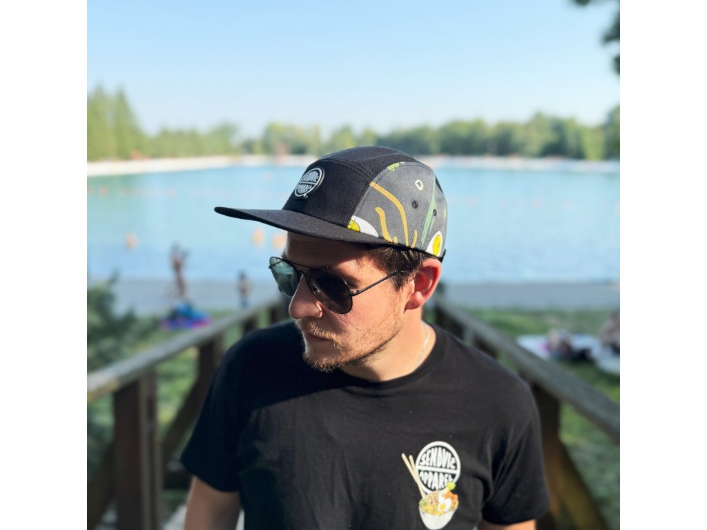 Pěti panelová kšiltovka s ilustrací po stranách čepice. Na čele je decentní logo a strany hrají všemi barvami.