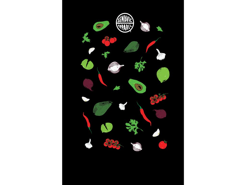 Ručně ilustrovaný potisk plný barev a výrazných tvarů tě promění ve stylový recept. A pozor – napatlat guacamole na tričko nikdy nevypadalo tak dobře.