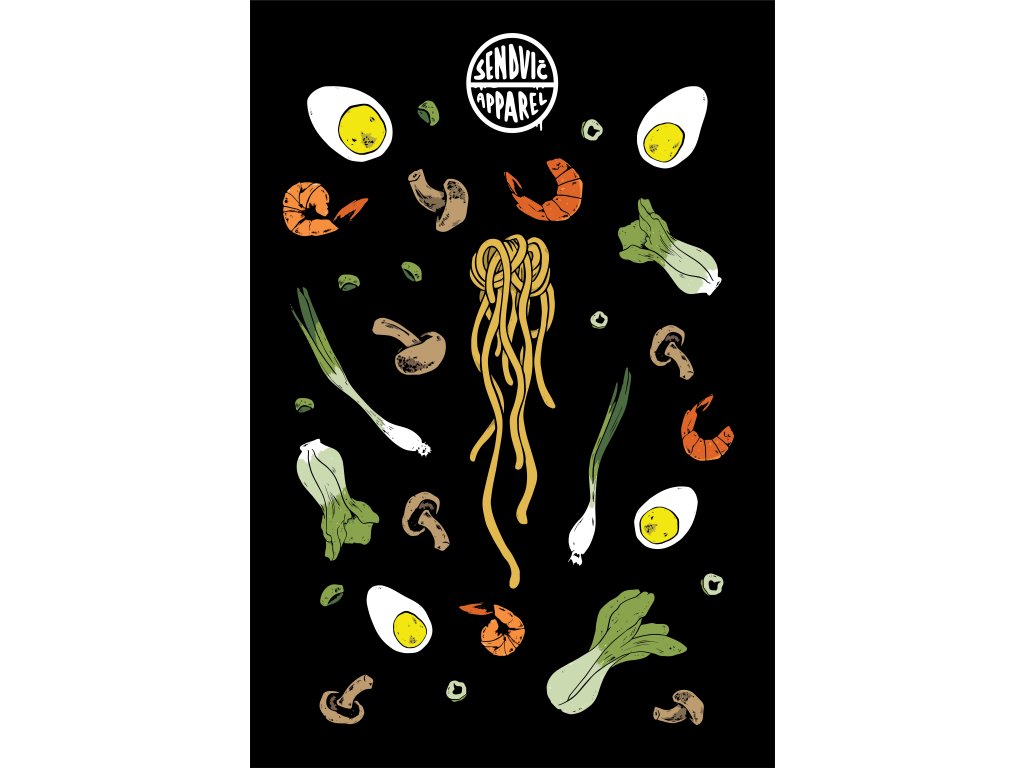 Zapomeň na fast fashion. Tohle je slow cooked design. Udon, vejce natvrdo, shitake, krevety, pak choi i jarní cibulka – všechno letí jako při vaření ve stavu beztíže.