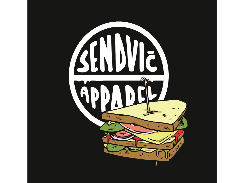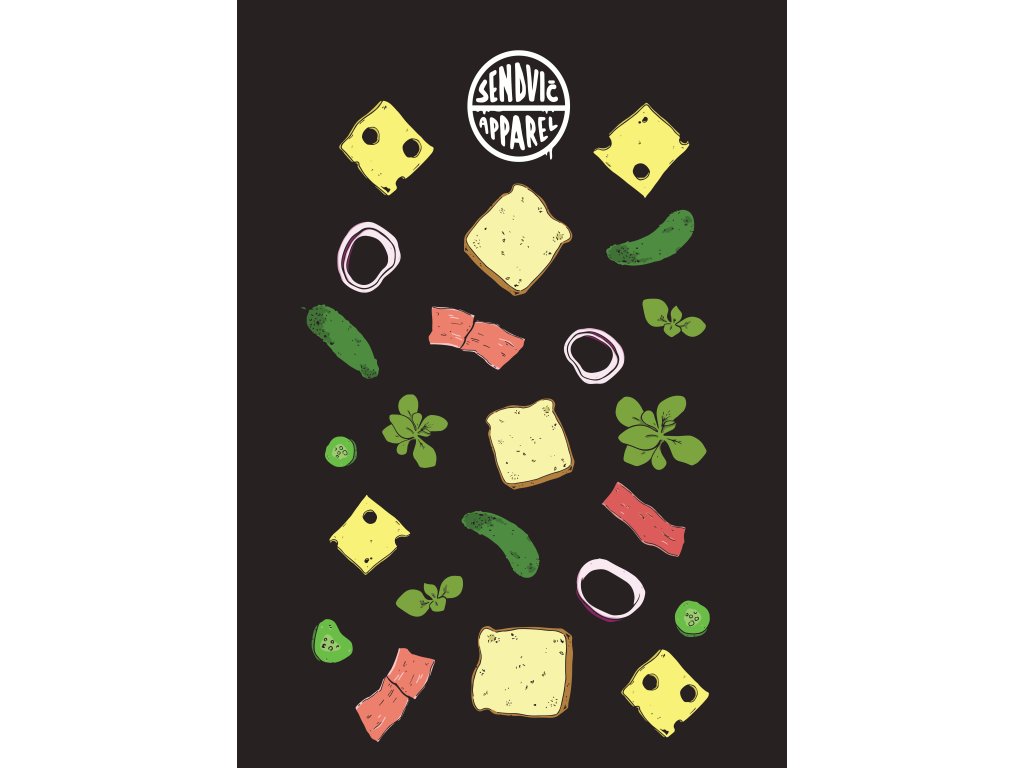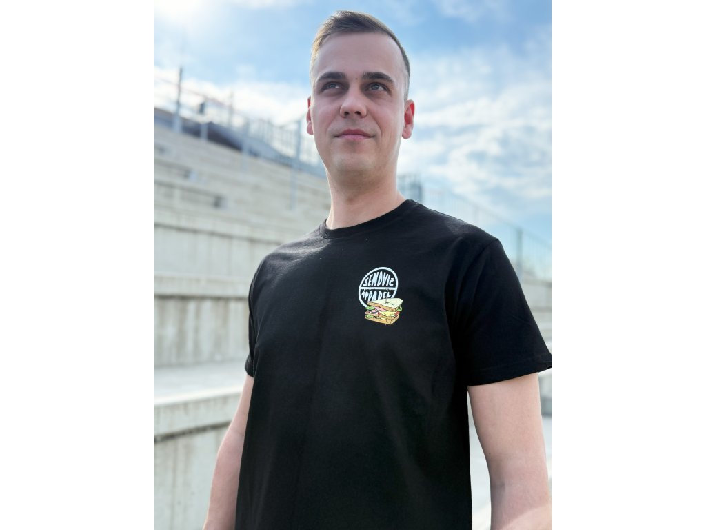 Tohle není jen tričko – to je celý recept! Ilustrace na zádech ti ukáže sendvič rozebraný do poslední ingredience: plátky sýra, okurky, šťavnatá slanina, salát, chleba i cibulka. Zepředu elegantní logo s hotovým sendvičem, zezadu exploze barev a chuti – přesně podle receptu Sendvič Apparel.